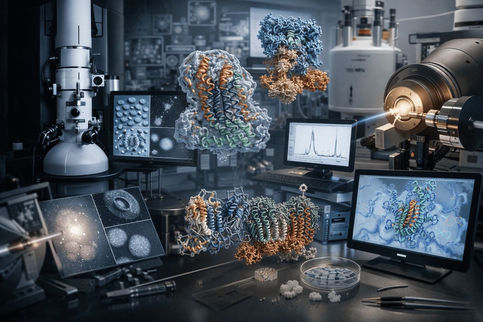These services provide high-throughput crystallisation pipelines, cryo-electron microscopy (Cryo-EM), nuclear magnetic resonance (NMR), and X-ray crystallography for atomic-level insights into proteins, complexes, and host–pathogen interactions. Cryo-EM services include electron crystallography, cryo-electron diffraction (cryo-ED), single-particle analysis, and electron tomography (ET), supporting studies of large macromolecular complexes and membrane proteins in near-native states. In silico structure–function predictions complement experimental analyses to refine interpretations.